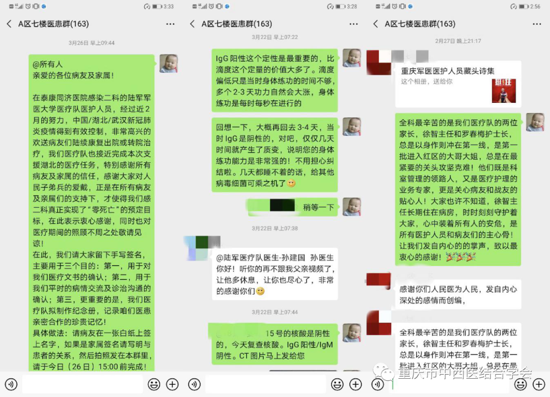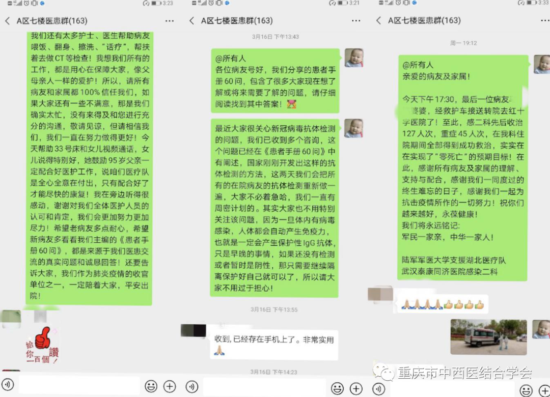 在病区批量收治患者当天,科室一下收治了50余名患者,为了方便与患者沟通联系,病区专门组建了一个“A区七楼医患群”,孙建国教授也分担起了“群主”的职责。有了“群主”的头衔,孙建国教授更是24小时在线。“孙主任,我在前面的CT检查结果麻烦帮我看看……”“请问医生,我两次核酸检测都阴性了,为什么还要在看CT结果才能出院呀?”“群主,我出院了在集中隔离点还需要注意些什么呢?”面对患者们的问题,孙建国教授总会在第一时间给患者们耐心解答。不仅如此,为了给隔离病区患者更好的心理照护,孙建国教授还特地邀请到陆军军医大学新桥医院神经医学中心心理咨询专家贺英副主任在群里为大家进行心理辅导。在大家的共同努力下,群内氛围也十分活跃。有的患者会把自己治疗的感受与大家分享,有的患者会把拍摄的医护人员工作照分享到群里,有的患者出院时会在群里留下一封长长的感谢信,还有的老年患者因不方便使用微信,还专门让子女加进群里,随时方便了解治疗动态。