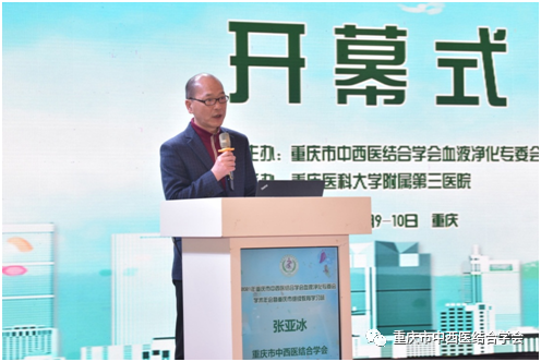 2021年4月10日由重庆市中西医结合学会血液净化专委会、重庆医科大学附属第三医院承办的重庆市中西医结合学会血液净化专委会2021年学术年会在重庆渝北区银鑫世纪酒店隆重召开,100余家单位300余名医护人员现场参加了此次会议,同时8000余人次在线上共同分享了这一学术盛宴。开幕式由重庆医科大学附属第二医院廖晓辉教授主持,重庆市中西医结合学会张亚冰秘书长、重庆市中西医结合学会血液净化专委会主任委员杨聚荣教授、重庆市著名中西医结合专家袁发焕教授莅临会议并致辞。张亚冰秘书长在致辞中表示重庆市中西医结合学会血液净化专委会在过去的一年里为推动本地区血液净化领域的发展做出了巨大的努力,也取得了丰硕的成绩。期望专委会在今后的工作中,继续秉承中西医结合、守正创新的宗旨,不断推进血液净化建设,为促进我国医疗卫生事业的发展而作出不懈的努力,为建设具有中国特色的社会主义医疗事业做出贡献。