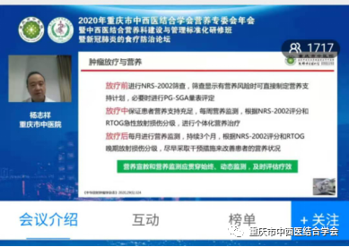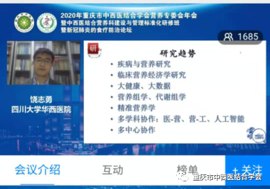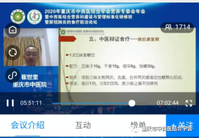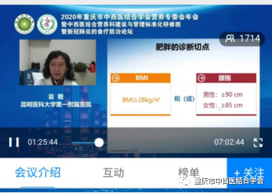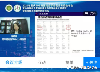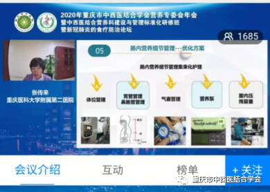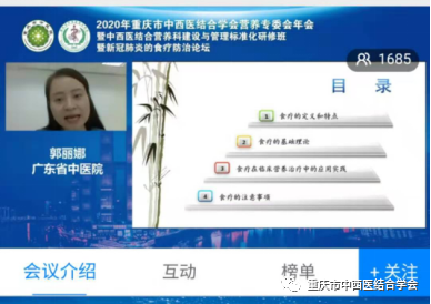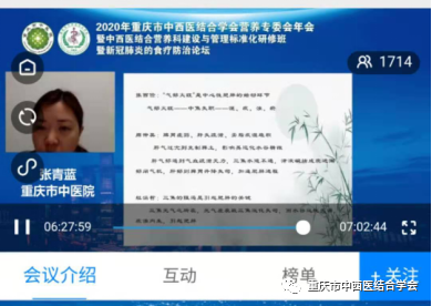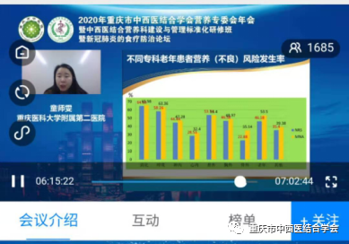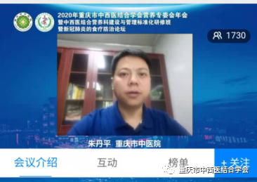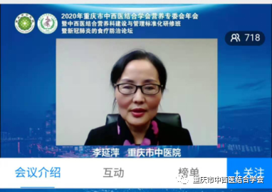 2020年重庆市中西医结合学会营养专委会年会暨中西医结合营养科建设与管理标准化研修班暨新冠肺炎的食疗防治论坛于2020年11月14日通过网络直播平台在线上顺利举行,按计划圆满完成了会议的全部议程。本次会议注册参会人员共计95人,在线观看达1700余人次。专委会主任委员李延萍教授在会议开幕式致辞中提到:营养是建设健康中国的重要基础,营养工作也得益于大健康蓬勃发展的时代,做好营养工作也是保障人民健康最重要的手段,要坚定不移地贯彻习总书记“要不断优化诊疗方案,坚持中西医结合”的指示,传承发展祖国传统医学事业,食养结合,集百家之长,荟萃精英,守正创新,为人民健康水平的提高做出我们应有的贡献。